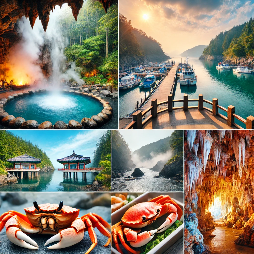 | 온천욕과 자연 경관이 어우러진 힐링 공간 | 신선한 대게를 바로 맛볼 수 있는 미식 명소 | 석회암 지형이 빚어낸 동굴의 신비한 아름다움 |