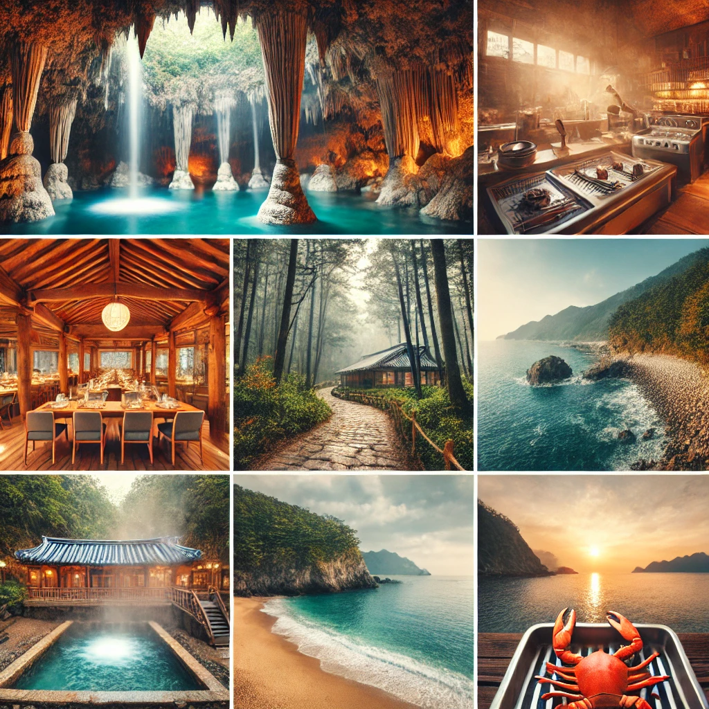 | 종유석과 석순의 아름다움, 신비한 동굴 탐험 | 알칼리성 온천수로 피부 진정과 피로 회복 | 싱싱한 대게와 회덮밥, 해산물 즐기기 최적 |