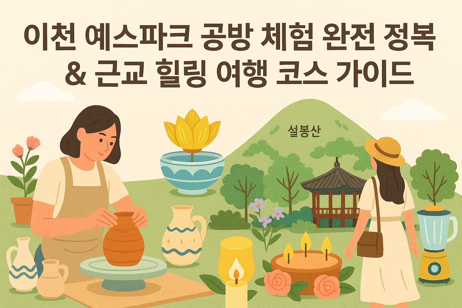 본 글에서는 작가와 직접 만나 나만의 작품을 만들 수 있는 인기 공방 추천과 함께, 설봉산 둘레길, 산수유마을, 테르메덴 온천, 감성 카페, 자연 속 숙소까지 이천 근교에서 즐길 수 있는 힐링 여행 코스를 풍부하게 안내합니다.