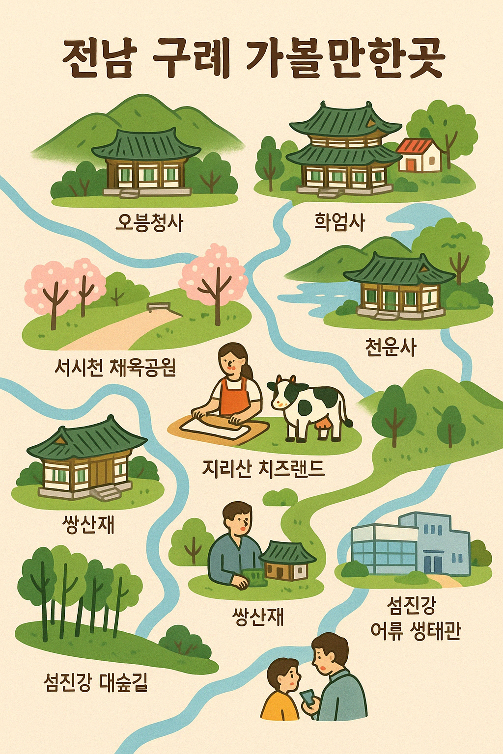 이 글에서는 오봉정사, 화엄사, 천은사 같은 천년 고찰은 물론, 치즈랜드, 쌍산재, 어류 생태관 등 가족과 함께 즐길 수 있는 8대 여행지를 역사와 특징, 즐길 거리까지 풍부하게 소개한다.
