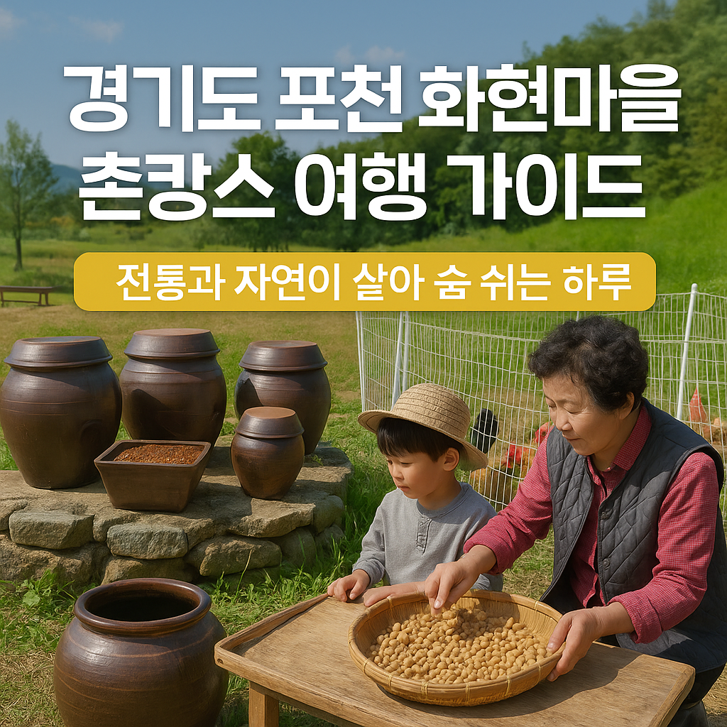 서울 근교에서 전통 장 담그기, 동물 체험, 숲 속 트래킹까지 한 번에 누릴 수 있는 감성 힐링 여행지. 경기도 포천 화현마을은 진짜 농촌의 삶을 체험하며, 아이들과 함께 배우고 어른들은 치유받는 ‘리얼 촌캉스’ 여행지입니다.